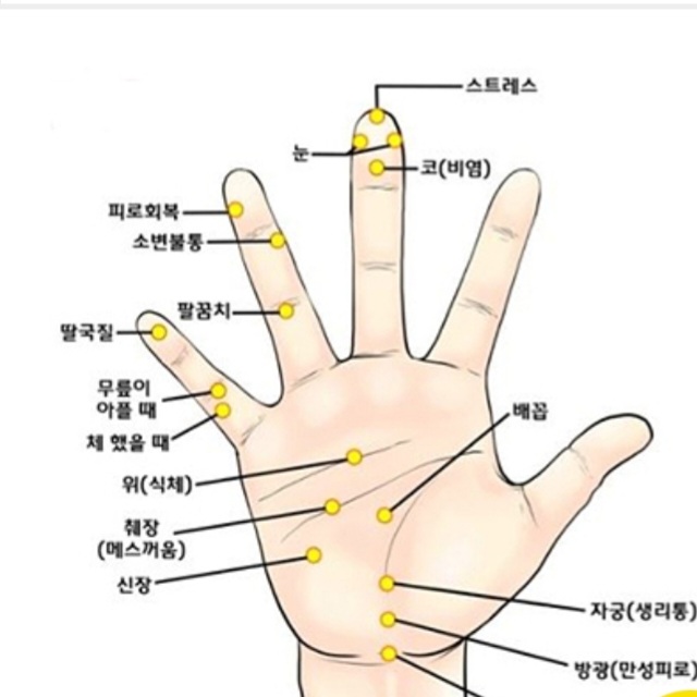 평소에 손 지압점을 자주 눌러주면 두통, 치통, 생리통, 소화불량 등의 증상이 완화되는 효과를 얻을수 있습니다.