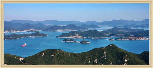 새파랗고 싱그러운 아침의 해안선의 조국의 포옹