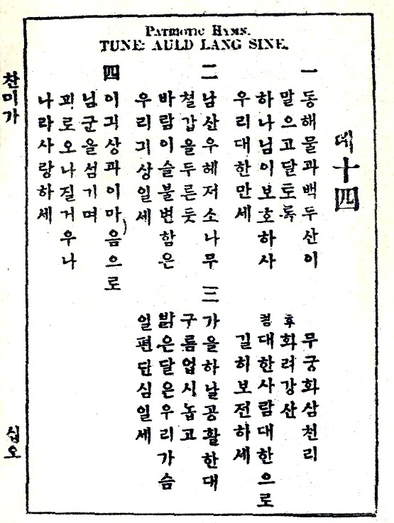 그 뒤 「애국가」가 스코틀랜드 민요「Auld lang syne」, 즉 「이별의 노래」의 곡조에 붙여