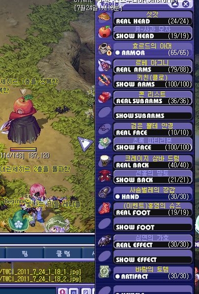 웅이돋네 : 칭호:2,사과모자:4,삿갓:4,클로:9,치상콘리스트:10,검은뿔테안경:10,초파리:3,크레이지삼바드럼:15,선홍의망토:4