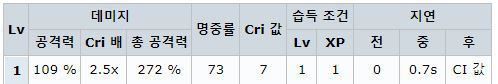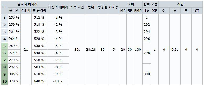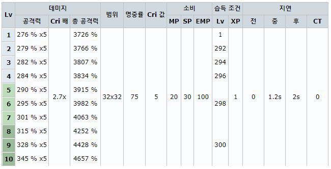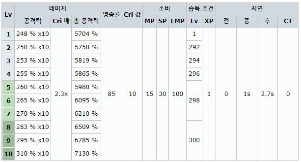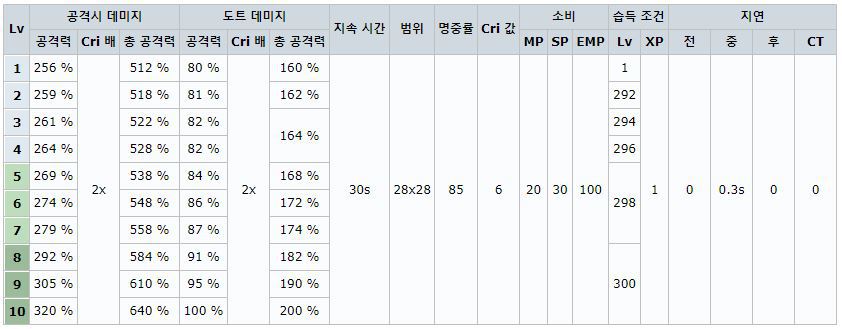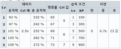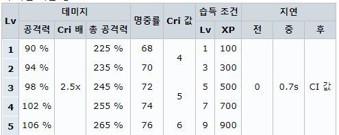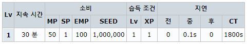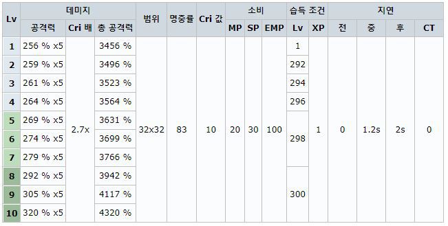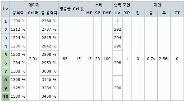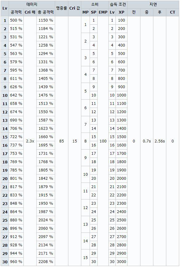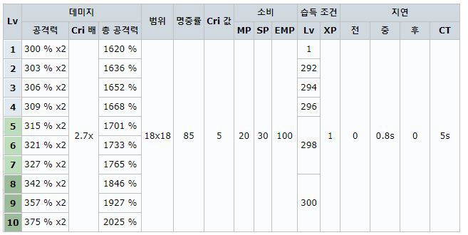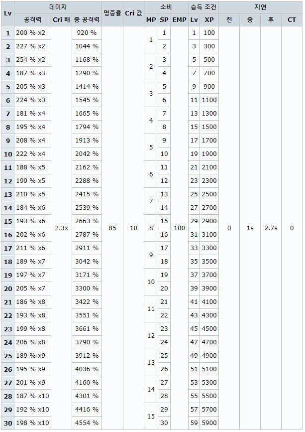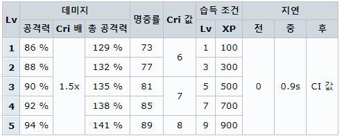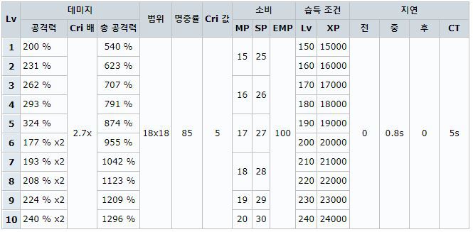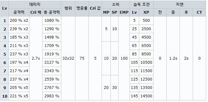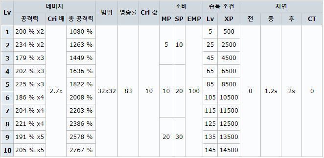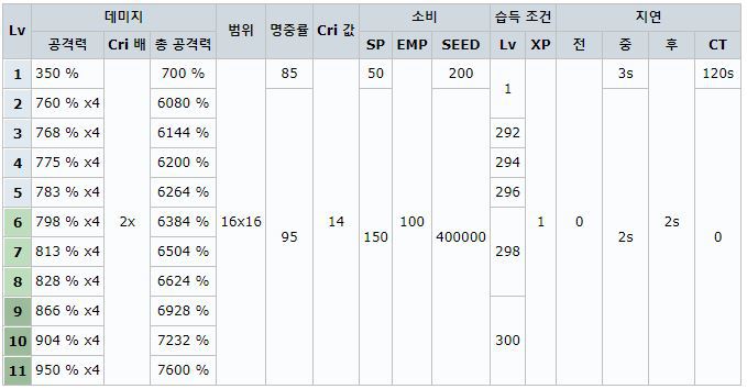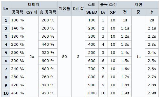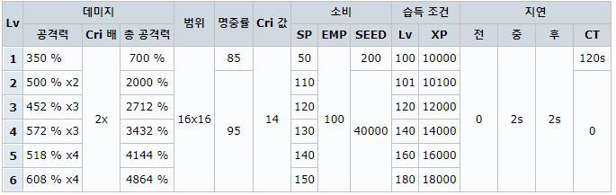 · 화면 보다 넓은 범위 공격 · Lv1 : 크리티컬 시 일정 확률로 추가 효과 [(스턴 100%, 5s) ,(경직)] · Lv2 이상 : 크리티컬 시 일정 확률로 추가 효과 [(스턴 20%, 5s) ] · 팀에 '루시안'이 있다면 ' 승부사 '의 효과로 소비 SEED감소 · 「마스터리 No.1」의 선택에 따라 추가 효과 극한 후 극한 전