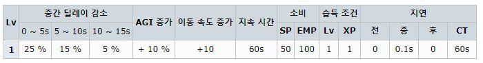· 이동 속도 증가(+10) · AGI 증가(+10%) · 중딜 감소(지속시간 15s) 0s- 5s : 25 % 5s-10s : 15 % 10s-15s : 5 % 15s 이상: 0 % · 「마스터리 No.4」의 선택에 따라 추가 효과