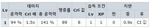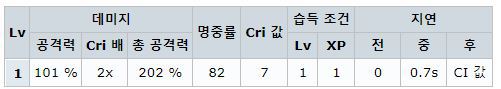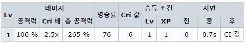 · 사정거리 28 [단일 공격] · hit시 추가효과 [스턴] · 중독 추가 (최대 100) ( 1초 간격으로 지속 대미지 , 대미지는 스택 수에 비례) 극한 후 극한 전