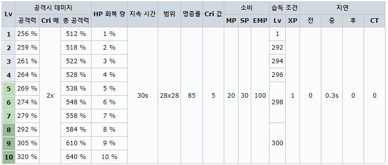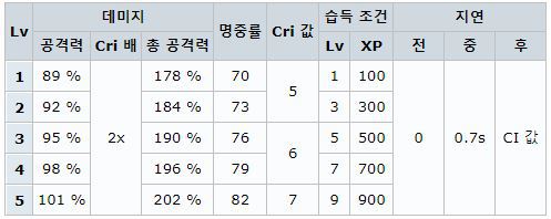 · 사거리 22 · 크리티컬 2배 · STAB, HACK에 의존하지 않는 물리 데미지를 준다. · 팀에 '루시안'이 있다면 ' 승부사 '의 효과로 소비 SEED감소 · 「마스터리 No.1」의 선택에 따라 추가 효과