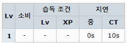 · 사정거리 16 [자기 중심 범위 공격 60x60] · 자신을 포함한 팀의 레어 드랍률 증가 (30분) · 레어 증가율(%) = 주사위 던지기 x 10 % · 팀에 특정 캐릭터가 존재하면 스킬 효과 발동 티치엘 : 럭키 다이스의 레어 드랍률이 증가 루시안 : 돈던지기/포격/럭키다이스의 비용이 감소 보리스 : 럭키 다이스의 주사위가 항상 6이 나옴 · 「마스터리 No.1」의 선택에 따라 추가 효과
