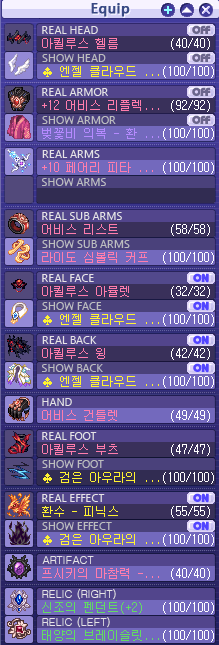 이외 착용하고 있는 템은 모두 제작으로 떡작 상태입니다. 최근 이클 진입에 앞서 어비스 두 부위를 제작했습니다. 어비스 리스트 직작을 해보겠다고 했을 때 선뜻 훈장을 주신 다정다감 '공룡'님, 그 소식을 듣고 마법베기 S28을 뽑아준 다정다감 '초아'님. 다시 한 번 더 이 글을 통해 감사함을 표현드리고 싶었어요. 정말 감사합니다.
