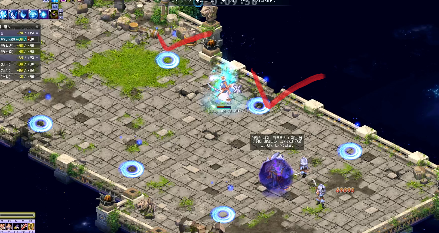 딱딱한 기둥같은 녀석인데요. 보스 맵에 진입하면 포탈이 6개가 존재합니다. 스펙이 낮을 수록 모든 포탈에 들어가 석상을 부셔야합니다. 여러번 잡아보고 패턴이 익숙해졌다면 붉은 색으로 마크해둔 두 석상만 부셔도 괜찮습니다. 가장 위 석상은 힐이 들어가고 가운데 석상은 딜을 50% 감소시키는 장판을 소환합니다.