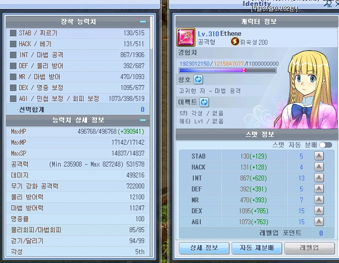 스펙: 순마공 1906, 5각 연강마, 고방 마스터, 아퀼5셋, 12강 어비스스태프,