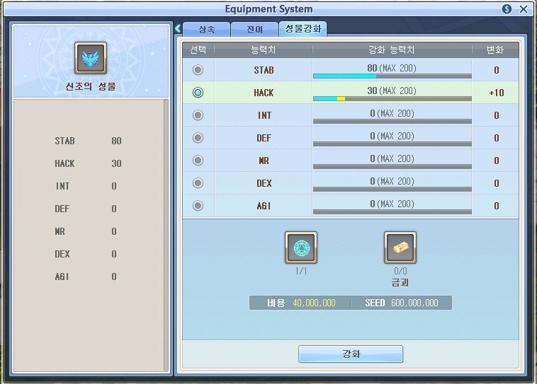 최종 보스인 신조를 퇴치하면 획득할 수 있는 ‘신조의 기운’ 아이템과 Seed를 이용하여 신조의 성물을 강화시킬 수 있습니다.
