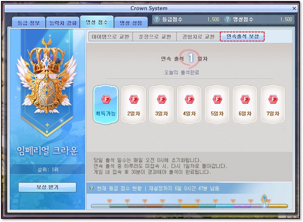 ④ 연속 출석일수 보상으로 명성 점수를 획득할 수 있습니다.