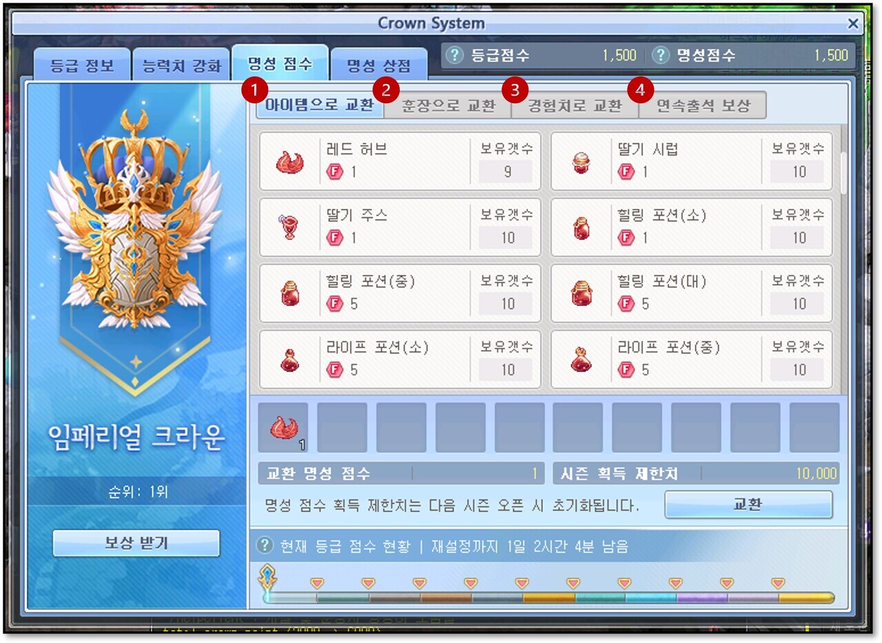 ① 특정 아이템을 명성 점수로 교환할 수 있습니다.