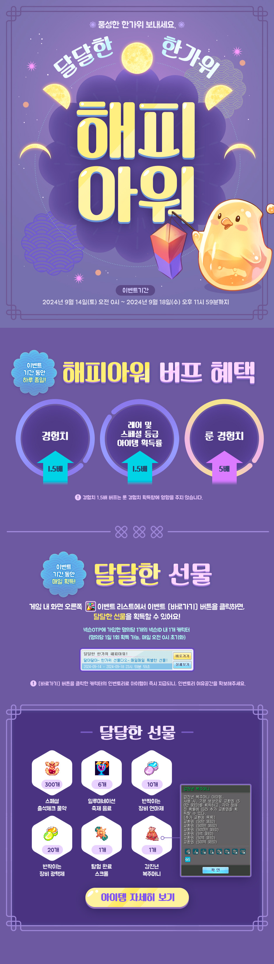 달달한 한가위 해피아워 작성자혜린|작성시간24.09.11|조회수1,169 목록 댓글 2 글자크기 작게가 글자크기 크게가 다음검색 현재 게시글 추가 기능 열기 북마크 신고 센터로 신고 댓글 댓글 2 댓글쓰기 답글쓰기 댓글 리스트 작성자주저앉아 | 작성시간 24.09.12 저거 룬경험치 5배가 룬경험의 던전도 적용이되나여? tp사용으로 1시간씩하고있긴한데 시간이 너무안가요. 작성자[미스]세연돌 | 작성시간 24.09.12 경험치 1.5배는 룬경험 미적용이라는 부분만 명시한걸 보니 룬던전 5배는 해줄 수도 있으려나요ㅎㅎ 댓글 전체보기