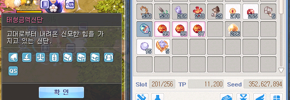 조합식 → 황금경단 10개 / 태극신단 10개 / 화용대환단 20개 / 풍정단 20개 조합비 1000만시드