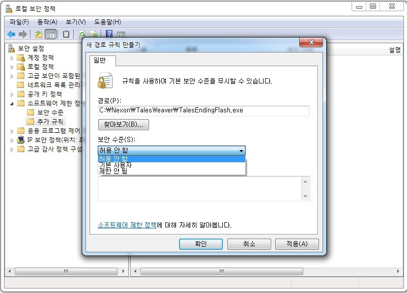 경로에 C:\Nexon\TalesWeaver\TalesEndingFlash.exe 입력후 보안수준 허용안함 적용 - 확인