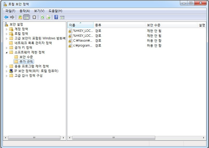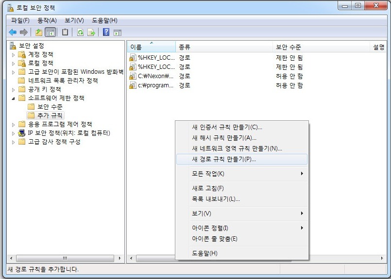 로컬보안설정-소프트웨어 제한정책-추가규칙-새경로규칙만들기