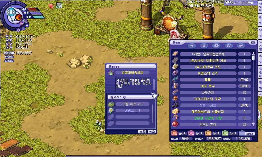 마법초는 데린에서 나오고 암흑마법중화제는 제조로 만들어야함