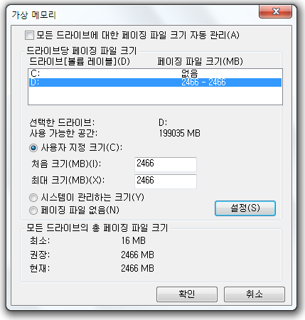 3) 총 가상 메모리가 4GB 미만일 경우 (XP의 경우 2GB 미만)