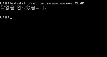 복구방법 : 위와 같은 방법으로 UserVA값을 기본값인 2048 입력, 또는 bcdedit /deletevalue increaseuserva 입력