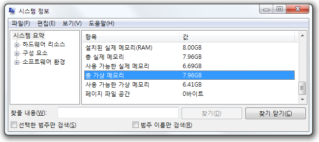 예시는 8GB 정도로 나왔습니다만, 해당 운영체제가 32비트라면 아무 소용없고 4GB밖에 이용하지 못합니다