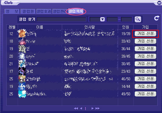 2. 가입할 캐릭으로 클럽목록탭에 표시된 가입할 자신의 클럽에 가입신청을 합니다.