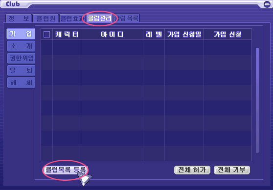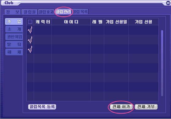 3. 다시 클럽장 캐릭으로 돌아와 클럽관리 탭에 가서 한명씩 체크해서 승인하거나 전체허가를 해주시면 됩니다.