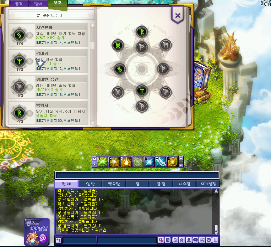 방랑자 1레벨에서는 채집시 경험치 1, 2레벨에서는 경험치 3을 줍니다. 룬스킬 레벨업을 하니 3배 정도 오르더군요.