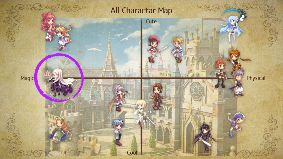 다음 캐릭터 맵을 봐도 아는대로, 로아미니 마법에 특화하고 귀여운 쿨의 중간에 위치하는 캐릭터다. 클로에에 가까운 전투 스타일이되어 있다고한다.