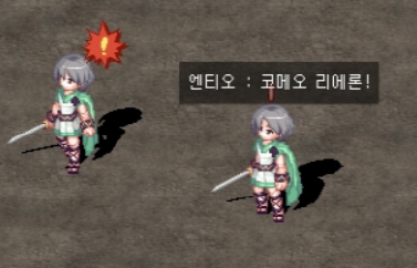경계병이라 할 수 있는 녀석입니다. 항상 많은 수가 몰려다니며, HP가 25%이하가 되면 사진처럼 '코메오 리에론!'이라고 외칩니다. 저 외침을 들은 주변의 다른 엔티오들은 '!'를 띄우며 플레이어를 인식하고 덤벼듭니다. 외치기의 인식범위는 상당해서 화면 밖의 엔티오들까지도 불러모읍니다. | |||