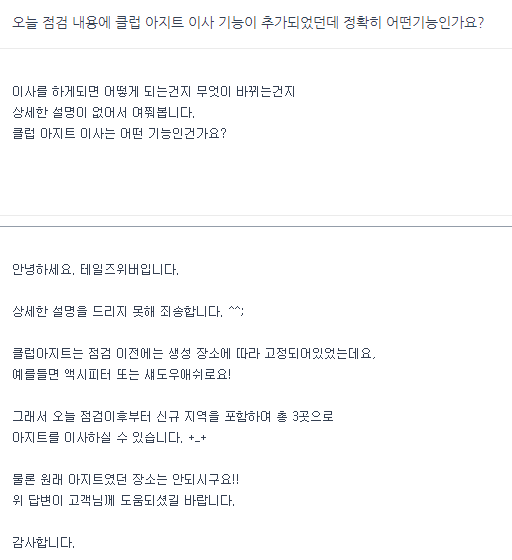 [알아봅시다〃]클럽 아지트 이사 기능 1:1 문의 답변 작성자[미스트랄]꼬맹까꿍이/다람쥐|작성시간16.01.07|조회수3,467 목록 댓글 7 글자크기 작게가 글자크기 크게가 클럽 아지트 이사 기능이 추가는되었는데 자세한 내용이 없어서 문의 보낸후 받은 답변입니다. 다음검색 현재 게시글 추가 기능 열기 북마크 공유하기 신고 센터로 신고 댓글 댓글 7 댓글쓰기 답글쓰기 댓글 리스트 답댓글 작성자[미스트랄]꼬맹까꿍이/다람쥐 작성자 본인 여부 작성자 | 작성시간 16.01.07 네냐플을 배경으로한 아지트를 추가한것같습니다. 작성자아르곤전지 | 작성시간 16.01.07 네냐플 이렇게 생겼어요! 이미지 확대 답댓글 작성자[제르나]멜포니아 | 작성시간 16.01.08 오....괜찮아 보인다 답댓글 작성자접엇다 | 작성시간 16.01.08 이쁘네용 답댓글 작성자[하칸]Coelus/버프계의요정 | 작성시간 16.01.14 요거다!!!! 댓글 전체보기