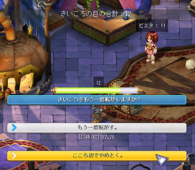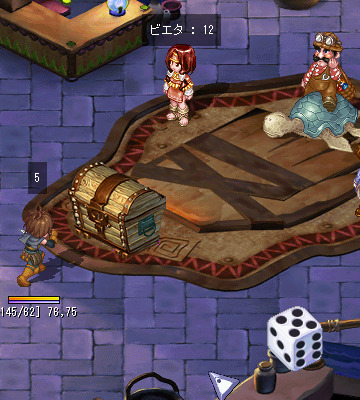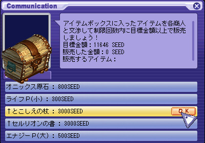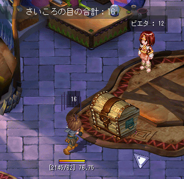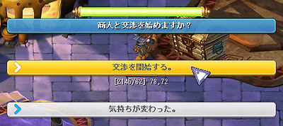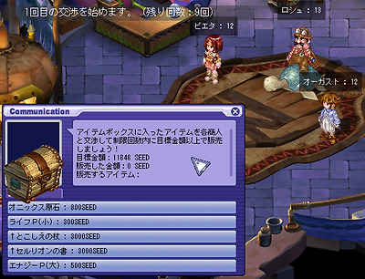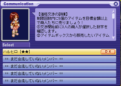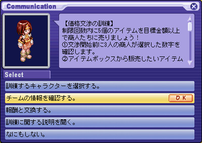 [진행 순서] 1. 카울에있는 NPC '비에타 " 에서"[grimgar] 가격 협상 훈련'퀘스트를 수주 후 NPC '비에타 " 에게 말을합니다. ※ 퀘스트를 수주하지 않으면 이벤트 맵에 입장 할 수 없습니다. 2. "훈련하는 캐릭터를 선택한다."를 클릭합니다. 3. 훈련하는 캐릭터 "하루히로"를 선택합니다. ※ 원격 퀘스트보다 챕터 퀘스트를 진행시켜 나가면 다른 캐릭터가 사용할 수 있습니다. 4. "하루히로"가 선택되어 있는지 확인하고 "OK"를 선택합니다. 5. "훈련을 시작한다."를 선택 이벤트 맵에 입장합니다. 6. 아이템 상자를 클릭하고 목표 금액과 NPC가 선택한 번호를 확인합니다. 교섭 횟수 10 회 중 NPC의 선택 숫자는 협상마다 바뀝니다. 7. 판매하는 상품과 협상하는 NPC를 선택합니다. 8. "협상을 시작한다."를 선택하면 협상이 시작됩니다. 판매하는 아이템을 변경하는 경우 또는 교섭하는 NPC를 변경하는 경우, "마음이 바뀌었다."를 선택합니다. 9. 주사위를 굴려 주사위의 합이 NPC가 선택한 숫자보다 15 가까이 되도록 협상합니다. 10. 주사위의 합이 15을 초과와 협상 실패 합니다. 협상은 10 회까지 할 수 있으므로 실패하더라도 다음 협상 진행할 수 있습니다. 11. 주사위의 합이 NPC가 선택한 숫자보다 커진 경우 "근처 옆에서 그만 둔다."를 선택하여 아이템을 판매 할 수 있습니다. 12.NPC 좋아하는 아이템의 경우 2 배의 가격에 판매 할 수 있습니다. 13. 협상 한도 내에 목표 금액을 달성하면 퀘스트 완료됩니다. 이벤트 완료시 목표 가격보다 1000SEED 이상 많다고 팀 하루히로의 능력치가 추가로 상승하고 추가 보상으로 실버를받을 수 있습니다. 【주의 사항】 · 주사위의 합이 NPC가 선택하는 숫자 이상이되면 아이템을 판매 할 수 있습니다. · NPC에 의해 좋아하는 아이템과 싫어하는 아이템이 있으며, NPC가 좋아하는 아이템은 2 배의 가격, 싫어하는 아이템은 절반 가격, 그렇지 아이템은 원래 가격대로 판매 할 수 있습니다. 주사위 눈의 합과 NPC가 선택한 숫자가 같은 경우 주사위를 굴리는를 중단하면 어떤 아이템도 판매 가격이 절반 입니다. · NPC가 선택한 숫자보다 주사위 눈의 합이 작은 경우 "근처 옆에서 그만 둔다."를 선택하면 협상 실패합니다. · 협상은 10 회까지 할 수 있으므로 협상 실패하더라도 다음 협상 진행할 수 있습니다. 이벤트 완료 후 또는 이벤트 맵에서 퇴장 후 재 입장 가능해질 때까지 3 분의 쿨 타임이 발생합니다. TOP에 돌아온다