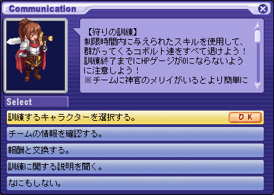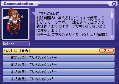 2016 년 5 월 25 일 (수) 점검 후 ~ 2016 년 6 월 22 일 (수) 점검 전까지 【참가 조건】 전체 캐릭터 참여 가능 ※ 솔로 만 진행 가능 [진행 횟수 제한】 1 주일에 10 시간 (월요일 0시 횟수 제한 재설정) 제한 시간 : 2 분 [진행 순서] 1. 네냐후루에있는 NPC '비낫토 " 에서"[grimgar] 사냥 훈련'퀘스트를 수주 후 NPC '비낫토 " 에게 말을합니다. ※ 퀘스트를 수주하지 않으면 이벤트 맵에 입장 할 수 없습니다. 2. "훈련하는 캐릭터를 선택한다."를 클릭합니다. 3. 훈련하는 캐릭터 "하루히로"를 선택합니다. ※ 원격 퀘스트보다 챕터 퀘스트를 진행시켜 나가면 다른 캐릭터가 사용할 수 있습니다. 4. "하루히로"가 선택되어 있는지 확인하고 "OK"를 선택합니다. 5. "훈련을 시작한다."를 선택 이벤트 맵에 입장합니다. 6. 빠른 슬롯에 등록되어있는 캐릭터의 스킬을 사용하여 몬스터를 사냥합니다. 7. 캐릭터의 체력이 0이되면 훈련 실패합니다. 8. 제한 시간까지 살아남을 수 있다면, 퀘스트 완료됩니다. 이벤트 완료시 선택한 캐릭터의 HP가 50 % 이상 남아 있으면 팀 하루히로의 능력치가 추가로 상승하고 추가 보상으로 실버를받을 수 있습니다. 【주의 사항】 · 이미 합류 한 멤버는 함께 싸워줍니다. · 신관의 메리이과 합류하고 메리이이 캐릭터의 HP를 회복시켜줍니다. 이벤트 완료 후 또는 이벤트 맵에서 퇴장 후 재 입장 가능해질 때까지 3 분의 쿨 타임이 발생합니다. TOP에 돌아온다