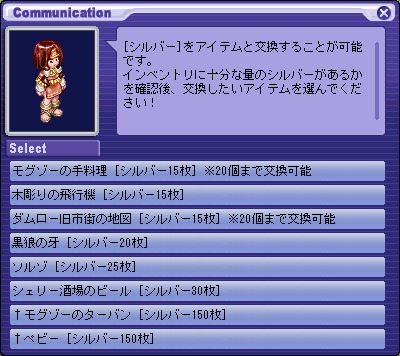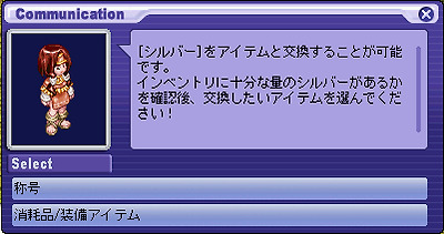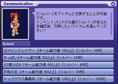 각 이벤트를 클리어하면 '실버'를 사용할 수 있습니다.실버는 각 이벤트 NPC '노마', '비에타 ","부덴누 ","비낫토 "에 말을 걸 보상 아이템으로 교환 할 수 있습니다. 1. 각 이벤트 NPC에게 말을 걸어 "보상과 교환한다."를 선택합니다. 2. "칭호"또는 "소모품 / 장비 아이템"을 선택합니다. 3. 「칭호」를 선택하면 다음과 같이 표시됩니다. 팀 하루히로의 모든 능력치가 조건을 충족하지 않으면 실버 칭호를 교환 할 수 없습니다. 4. "소모품 / 장비 아이템"을 선택하면 다음과 같이 표시됩니다. 5. 팀 하루히로의 능력치를 확인하려면 "팀의 정보를 확인합니다."를 선택합니다. 6. 팀 하루히로의 능력치를 올리는 것으로 교체 가능해진다 칭호가 있습니다.