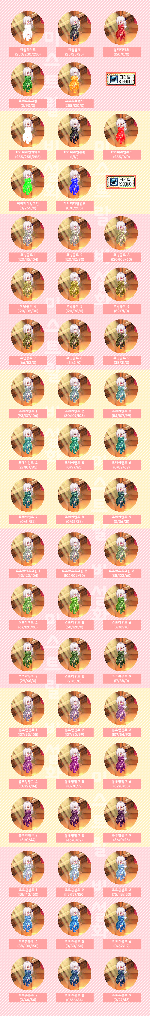 1. 코트장식1의 경우 (나머지 세 부위를 기본제복으로 두었을 때) 어플 염색약 순서 기준으로 구름솜부터 바이올렛 실버까지 아예 색을 확인 할 수가 없습니다.