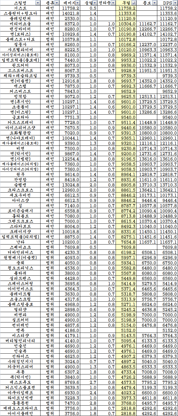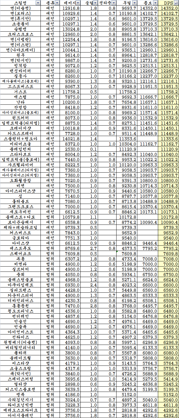 1. 콤보 2. 무딜 공식은 무딜dps = 스킬데미지/((스킬중딜레이+0.25)*0.65) 콤보dps = 스킬데미지*1.3/(((스킬중딜레이+평타중딜레이)*0.5+0.5)*0.65) 을 사용하였습니다. 평타중딜은 가장 짧은 중딜의 평타로 공통적용하였습니다. (예:루시안 연 + 찌르기 평타) 어제자 테섭패치 반영하였습니다. 디토네이트 특화 반영하였습니다. 거스트, 스퀘어쇼크, 체라+테슬라코일 추가하였습니다. 충뢰, 실프커터, 비연파, 티치엘의 메가블레이즈, 아이싱피어스, 일렉트릭볼, 메테오스트라이크, 아이시클레인 추가하였습니다. |