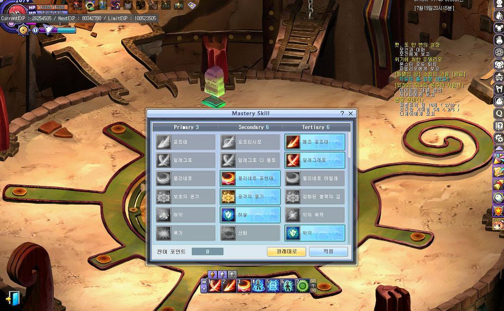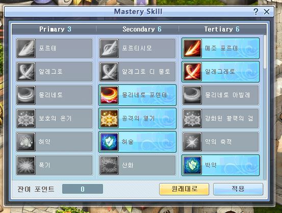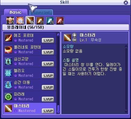 '마스터리'스킬은 몽플레이네 맨밑에있으며 '엑티브' 스킬이다 퀵슬롯에 등록해서 쓰거나 필요할떄 스킬창에서 두번클릭해서 사용