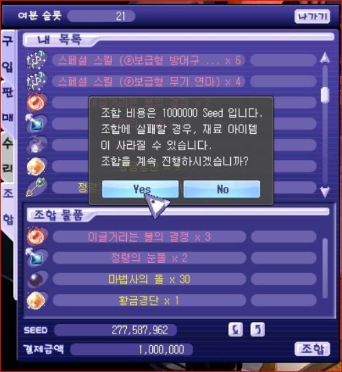 결정3개, 황금경단1개, 정령의 눈물1개, 마법사의돌 20개(재료를 많이 넣을수록 성공확률이 높아짐)