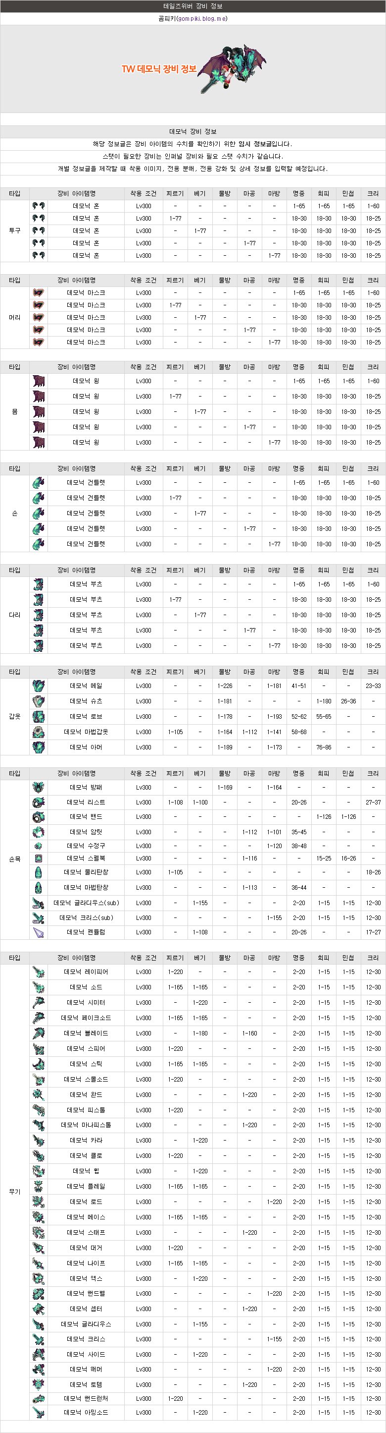 [아이템정보〃][테일즈위버] 데모닉 장비 정보 작성자[미스트랄]펜리르의허상|작성시간19.04.21|조회수89,350 목록 댓글 116 글자크기 작게가 글자크기 크게가 * 첨부된 파일을 받으실 때는 바이러스, 악성코드에 주의 해주세요. 다음검색 현재 게시글 추가 기능 열기 북마크 공유하기 신고 센터로 신고 댓글 댓글 116 댓글쓰기 답글쓰기 댓글 리스트 작성자[하칸]오승택 | 작성시간 22.09.27 좋은정보 감사합니다 작성자크레센도 | 작성시간 22.12.17 ㅇㄷ 작성자언능자자 | 작성시간 23.01.24 ㅇㄷ 작성자할일없을때 | 작성시간 23.06.18 데모닉옵션 ㅇㄷ 작성자에쓰오일 | 작성시간 23.08.07 뎀오닉옵션와드 댓글 전체보기