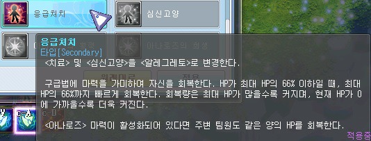 캐릭터체력이 0에 가까워질수록 더 많은 회복량을 보이는 응급치료입니다.