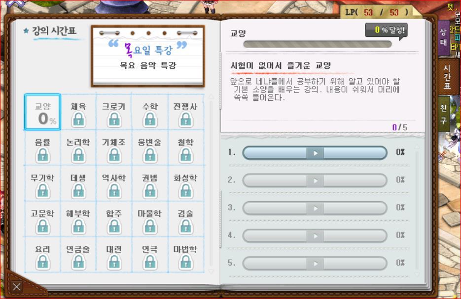 체육(힘), 크로키(매력), 수학(현명함) 수업이 열림.