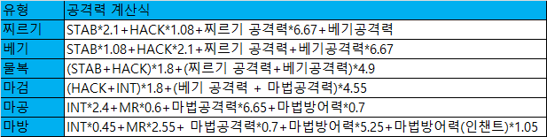 베기면 핵, 찌르기면 스텝, 마법공격력은 인트, 마방은 엠알, 물복은 핵스텝, 마검은 핵인트