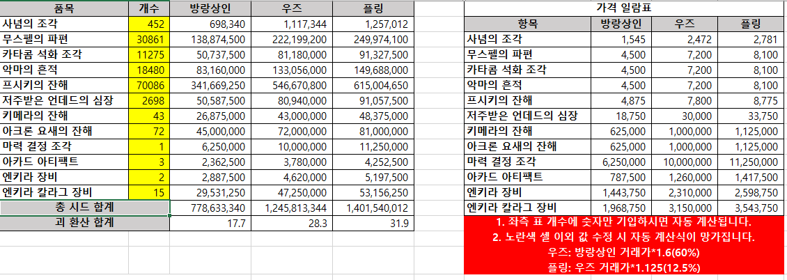 기존 매위에 있던 금액표, 실제 계산비율 확인해서 가격 일람표 데이터를 바탕으로 수식 적용했습니다.