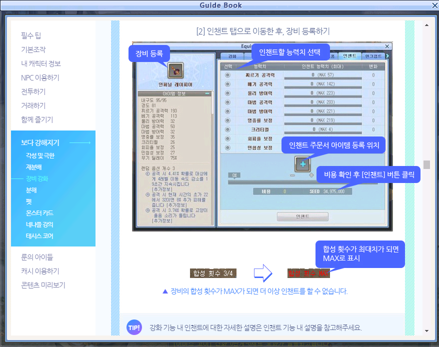 인게임 가이드창입니다. 장비에 관한 모든 설명이 자세히 나와있습니다.