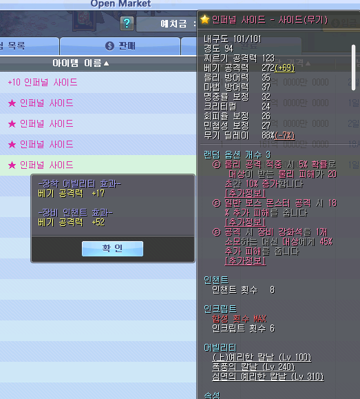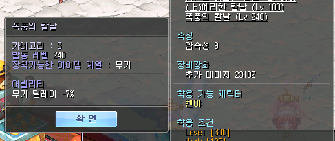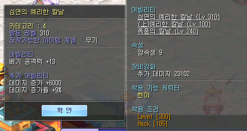 무기 - 일반보스 공격시 18% 뎀증 , 공격시 장비 강화석 사용 45% 추가뎀증, 5%확률로 물리피해 10%증가(마피증)