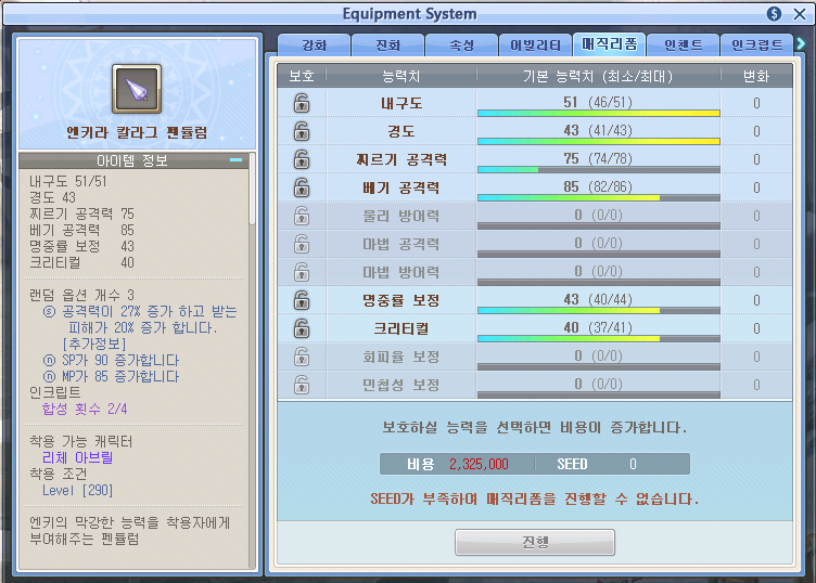 (운에따라 다르지만 보통 3회 인챈시 5~15괴 소모됨. 진짜 운나쁘면 1개인챈트에도 30괴소모될 수 있음)
