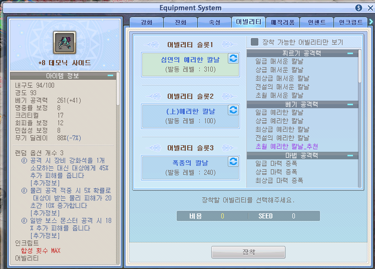 무기 어빌의 경우 인벤토리를 통한 강화 창에서 적용 할 수있는 건 어빌슬롯2(예리한칼날上), 3 뿐입니다.