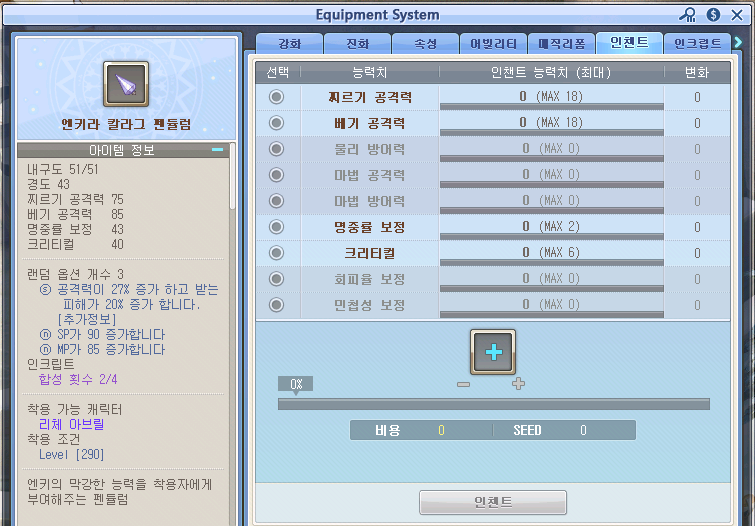 랜옵은 강화탭에서 적용가능하지만 수치가 랜덤으로 적용되므로