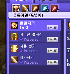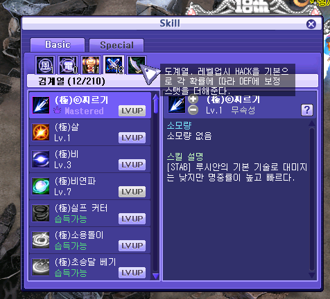 위 사진에 보면 '검 계열' 스킬이 (12/210) 즉 12개 찍혀있는걸 보실 수 있고