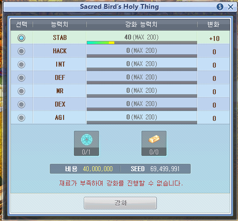 최초 10 > 40 스텟 까지는 기운 요구 수량 1개 및 4천만 시드 소모