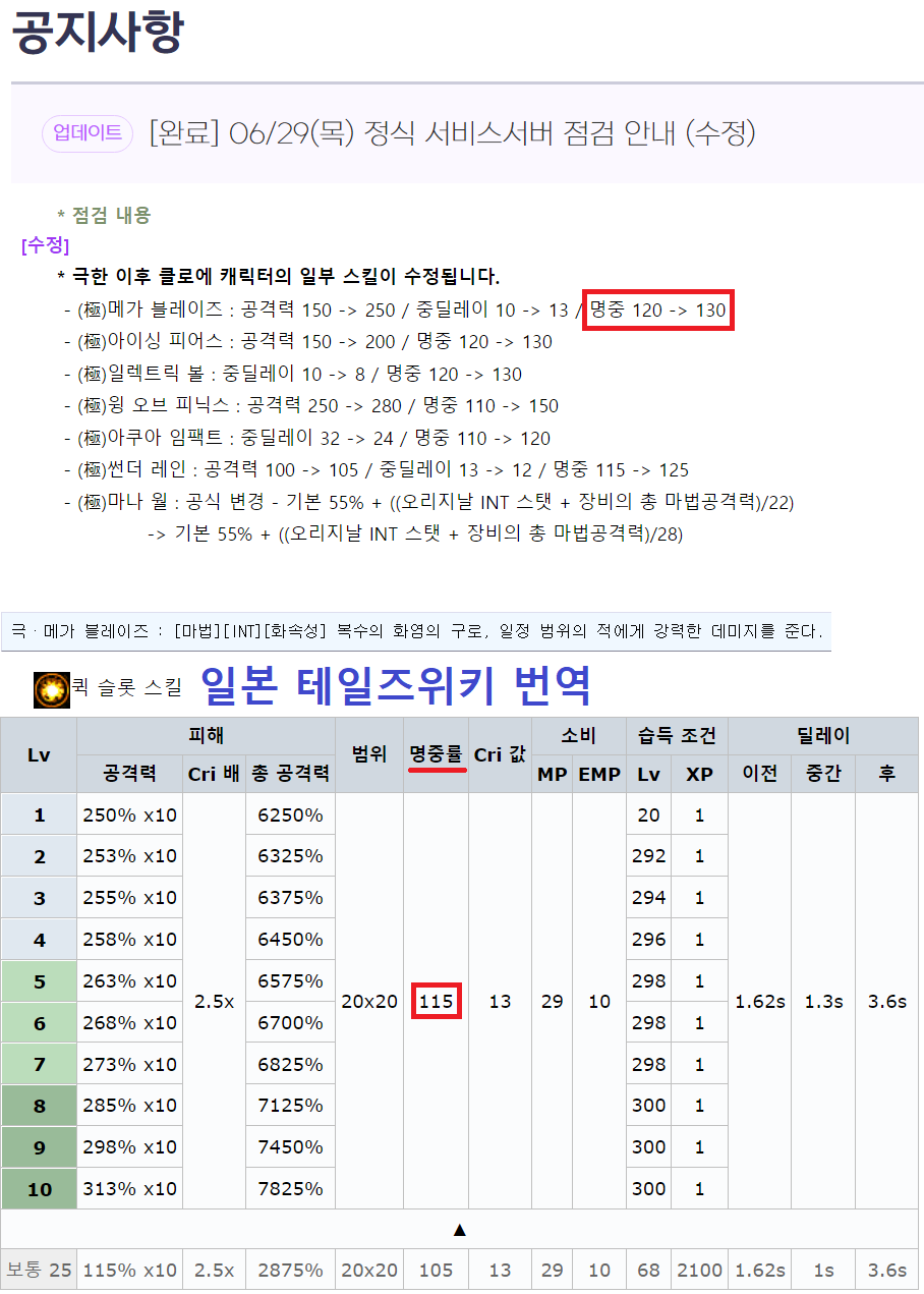 일본 테일즈위키의 명중률 내용이 사실인지 여부와 현재도 게임내에서 적용되고 있는지를 확인한다.