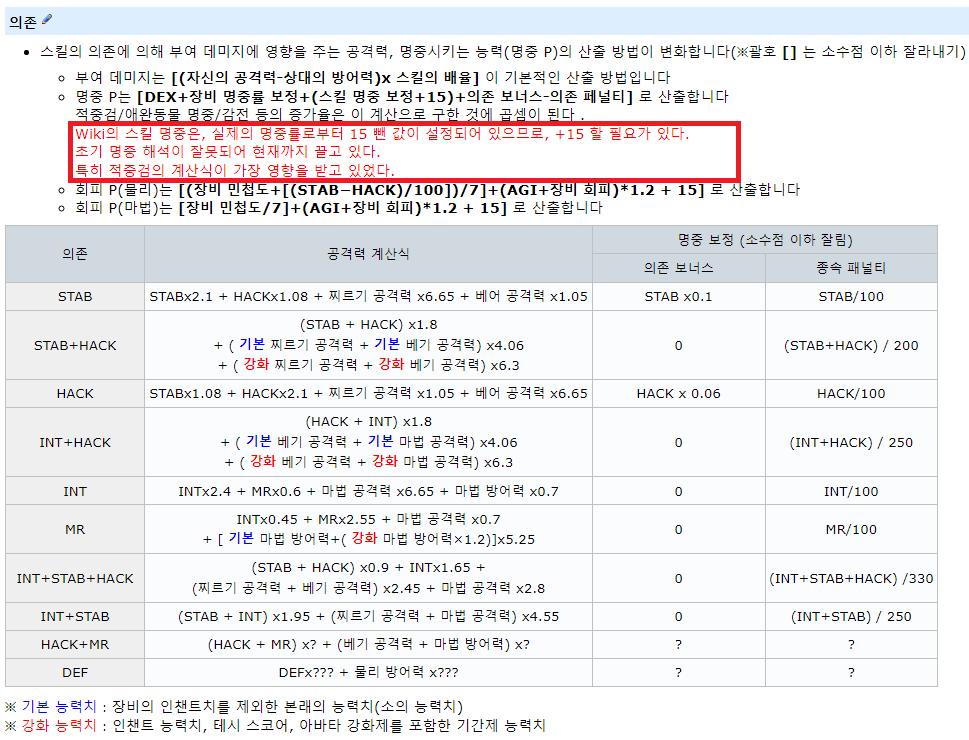 | 적.명중치 공식 | DEX + 명중률보정 + (15 + 스킬명중률) (※ [ ]는 소수점 이하 버림) |